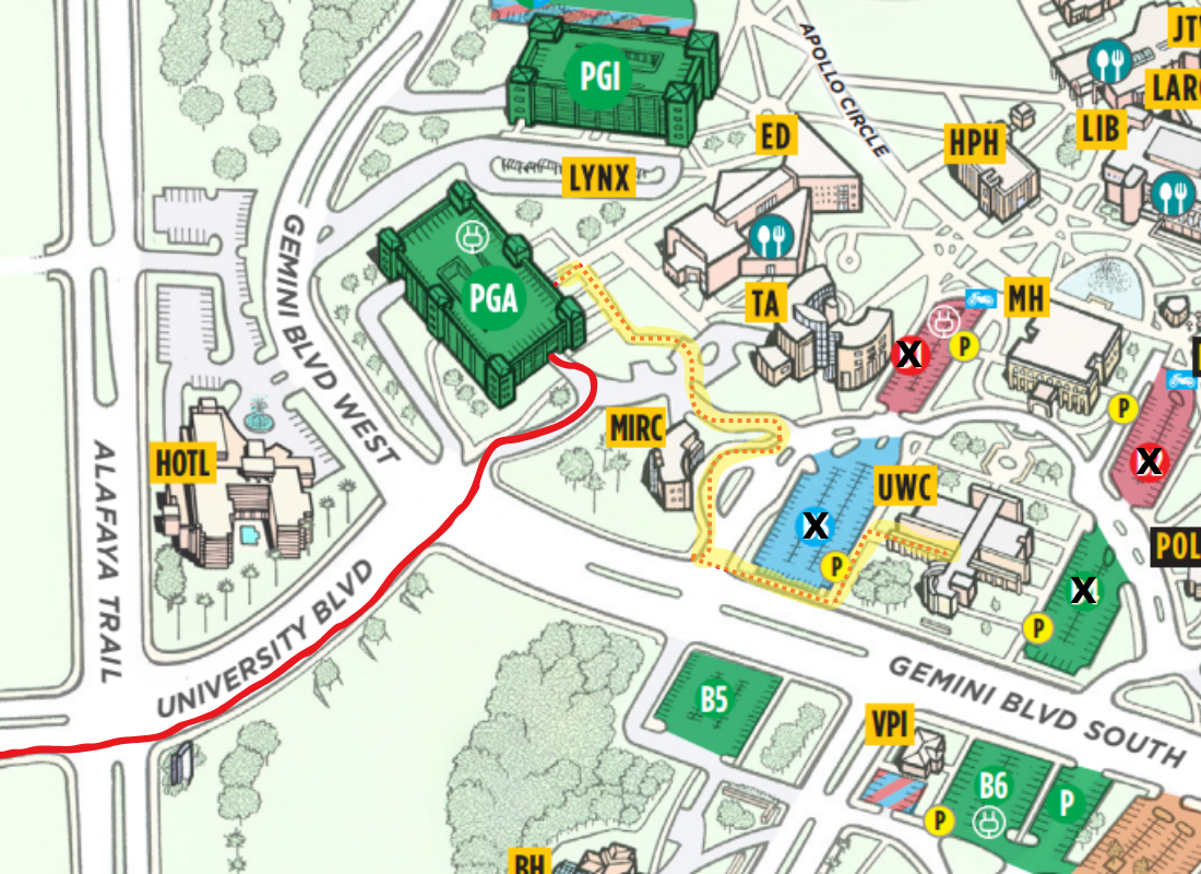 - The dotted/highlighted line is the walking route to the Duke Energy UCF Welcome Center.