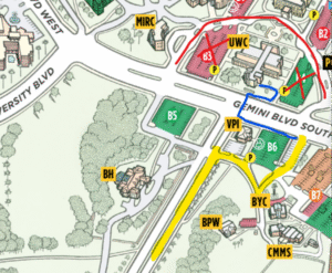 In the map below, the yellow path indicates the route the bus should take to enter campus, and the blue route is the path chaperones should walk to get students to the Welcome Center. The red locations are the lots and streets that will be inaccessible during the construction.
