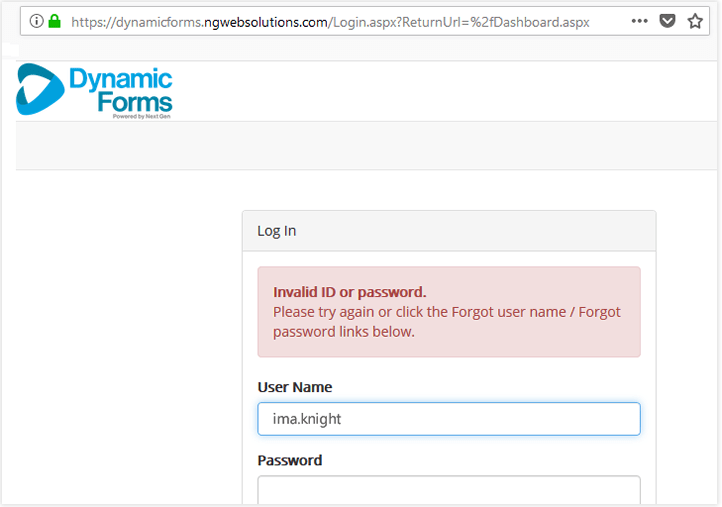Students should NOT use the general Dynamic Forms login page [https://dynamicforms.ngwebsolutions.com…], as this will result in an Invalid ID or password message: