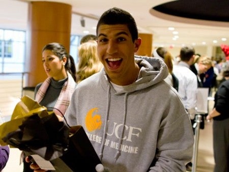 UCF College of Medicine students received a high-tech gift for their Christmas stockings Wednesday as local philanthropist Alan Ginsburg gave new iPads to each of the school’s 100 M.D. students. The hand-held electronic devices will allow students to take notes, review on-line scientific journals and 3-D medical imaging, and even take paperless exams. And students’ use of the iPad will be part of a two-year research study on the use of technology in medical education.