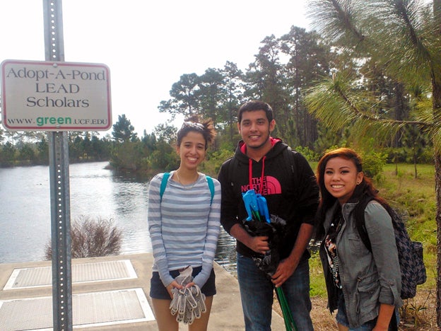 Everyone has seen a sign “Adopt a Highway” where volunteers clean up the trash along the road. Along the same idea, LEAD Scholars have volunteered to clean up but for something different, “Adopt A Pond.”This initiative was created during the fall semester 2013. Its original members (Rungrote Athajarusith, Wessley Dennis, Kenzhane Pantin, and Christian Vazquez) had a great desire to not only help the environment but encourage involvement and heighten awareness. Currently, the group has created a sign which does just that. The pond is located in the UCF Arboretum.