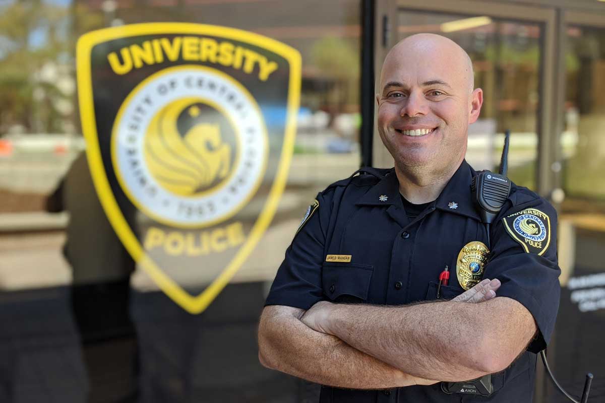 In Spring 2020, the UCF Police Department announced James Mangan ’09 will serve as regional commander. His duties include overseeing 20 sworn law enforcement officers, several civilian personnel and all police services for UCF Downtown, as well as for the Rosen College of Hospitality Management and College of Medicine. Based out of UCFPD’s substation on Amelia Street in downtown Orlando, we sat down with Cmdr. Mangan to get to know a little more about the UCF grad.