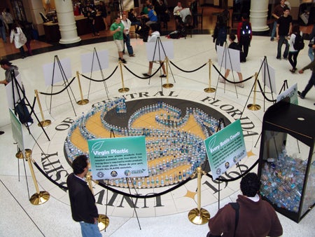 The pegasus on the Student Union floor was outlined with plastic bottles.