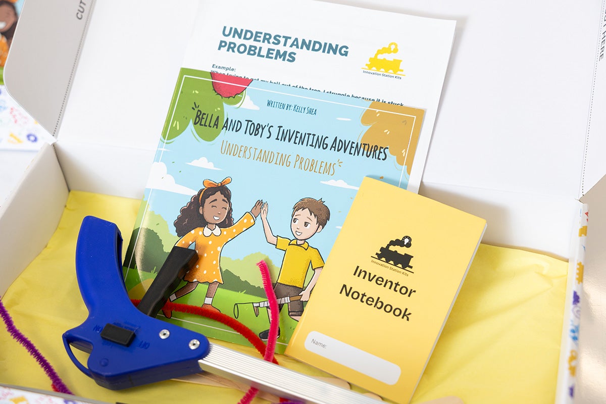 Each kit includes a relatable storybook — written by Shea herself — as well as guided activities, worksheets, crafting supplies, and lesson resources for teachers. Even the packaging is designed to be used as part of the inventive process. With the final kit in the series, students cut off the sides of the box to make into a poster board they’ll use to pitch their product.
