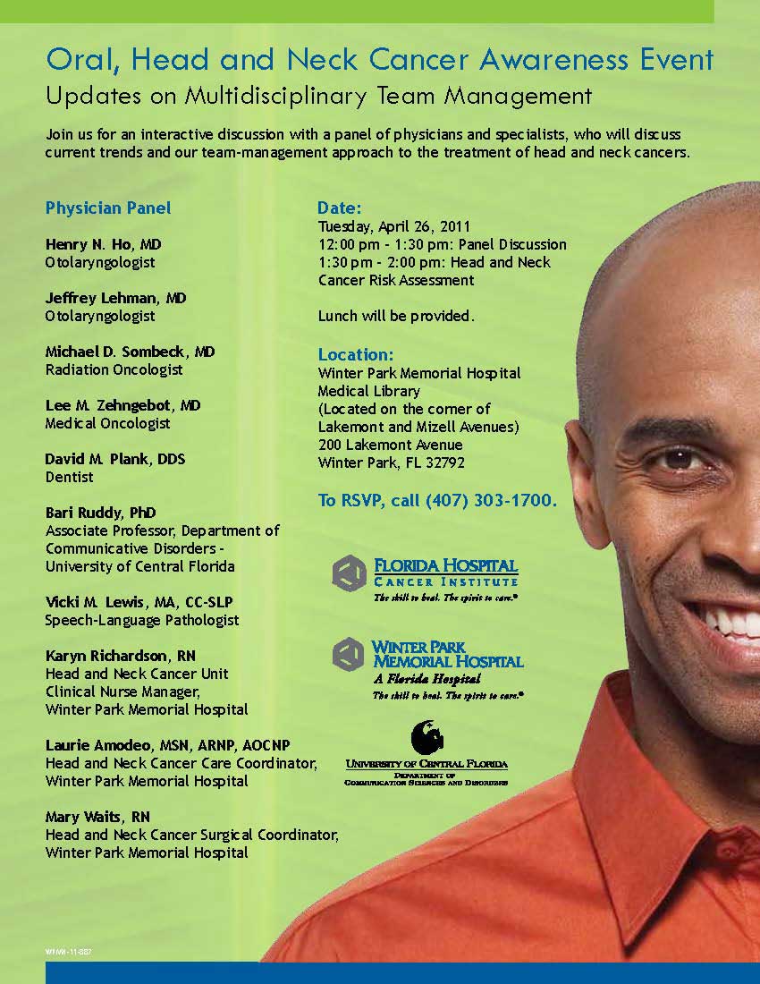 The University of Central Florida Communication Disorders Clinic, Florida Hospital Cancer Institute and The Ear Nose and Throat Surgical Associates will jointly offer free individual risk assessments for head and neck cancer on Tuesday, April 26.